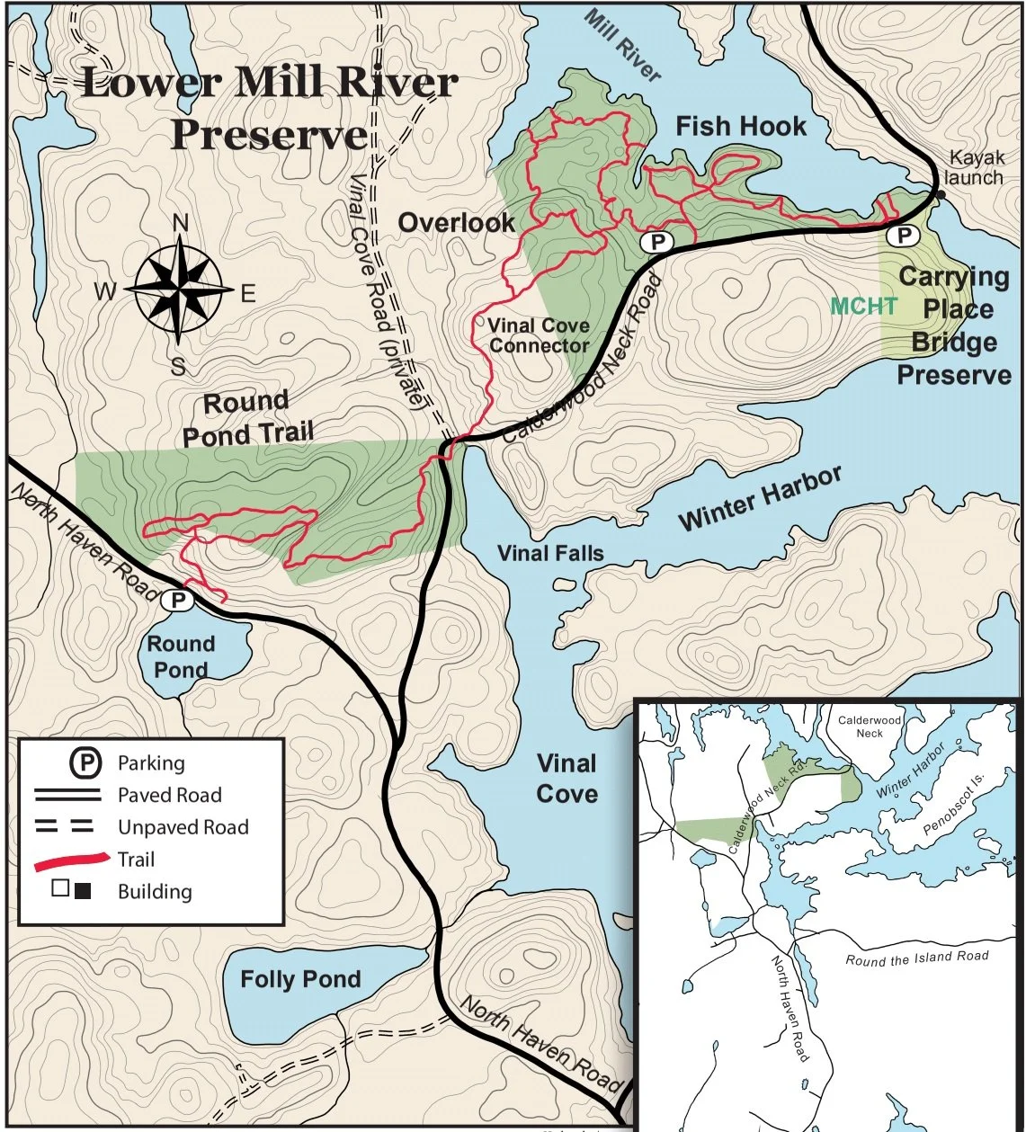 Lower Mill River forms a bookend to an existing preserve owned by Maine Coast Heritage Trust, Carrying Place Bridge Preserve, which is further protected by an easement held by VLT.