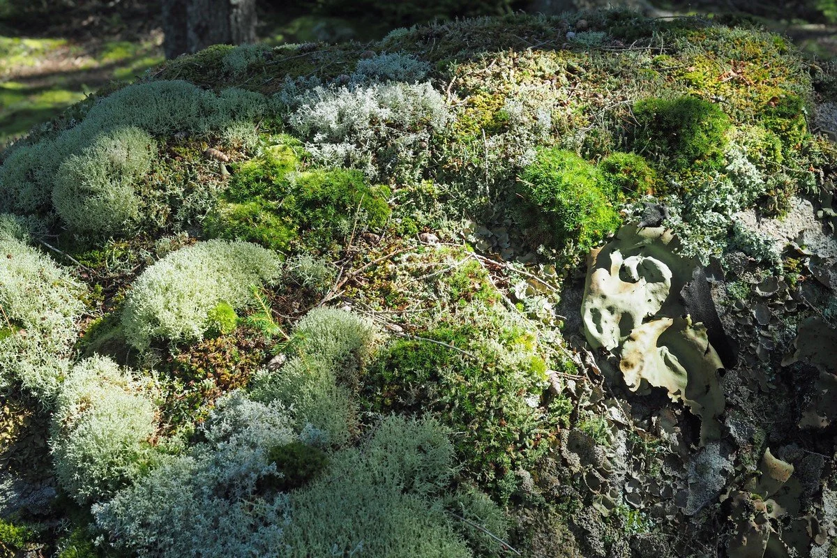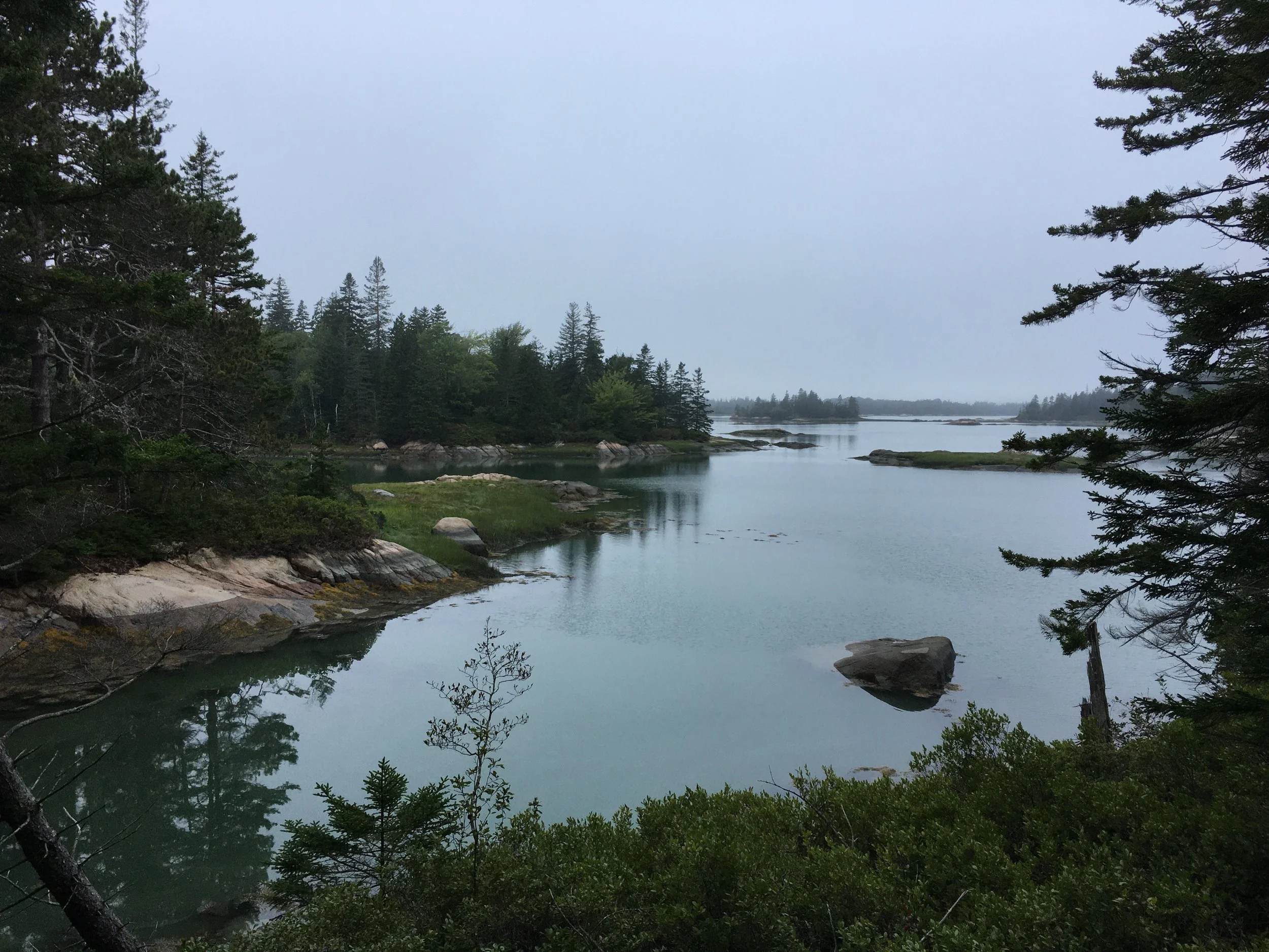 Vinal Cove Connector: From its beginning near Vinal Cove, the trail rises steadily through a series of shady ledges, with the land falling away dramatically to the left side. At the top of the hill, you’re 100’ above sea level, on mossy ledges under towering spruce trees. From here, the forest character changes sharply—the ground is nearly level, and young birch trees are on all sides of you, amid islands of huckleberries and bracken ferns. This is the evidence of a forest fire here roughly fifty years ago. A final 200 yards, mostly across open ledges, brings you to a fork in the trail—swing left to meander along the shoreline portion of Overlook, or go straight to cross Overlook quickly to reach Fish Hook. The trail is entirely on private property, intended only for hikers—there is no parking allowed at the trailhead or in the gravel driveway nearby, so please leave cars at one of the three designated parking areas for the preserves.